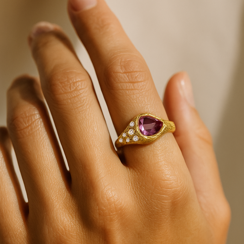 The bespoke experience with Atman begins with a personalized consultation, either at the Tzuki yam studio or remotely, where the vision for your unique jewelry piece is explored. This collaborative process involves selecting the finest stones and precious metals, and working closely with Atman to develop the piece's design, symbolism, and meaning. Every step of this journey reveals the exceptional creativity that Atman brings to each handcrafted piece.