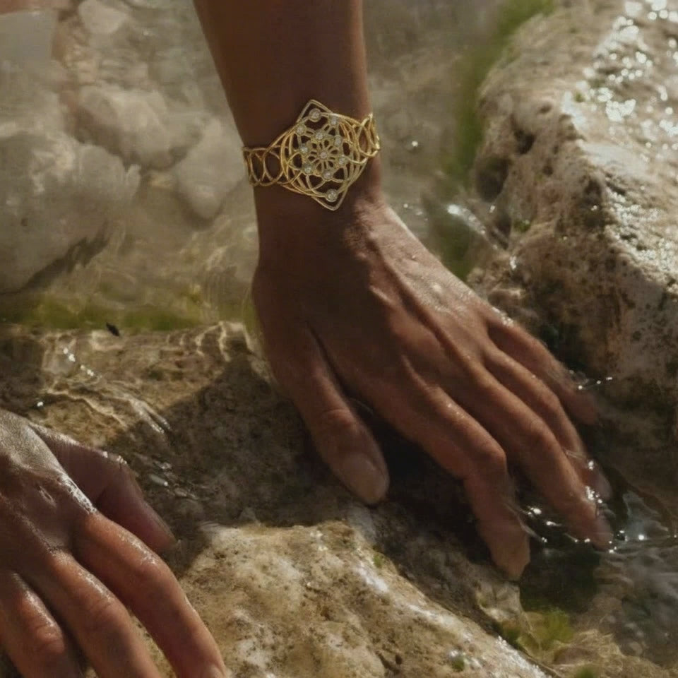 fashioned in pure 14k gold, The Kabballah Tree of Life and the Seed of Life are two powerful symbols that represent the interconnectedness of life. Together, these symbols offer a reminder to stay mindful and connected to our spiritual journey. Wearing it is like having a tree roots wrapped around your wrist ..This elegant bangle is set with 11 champain diamonds.